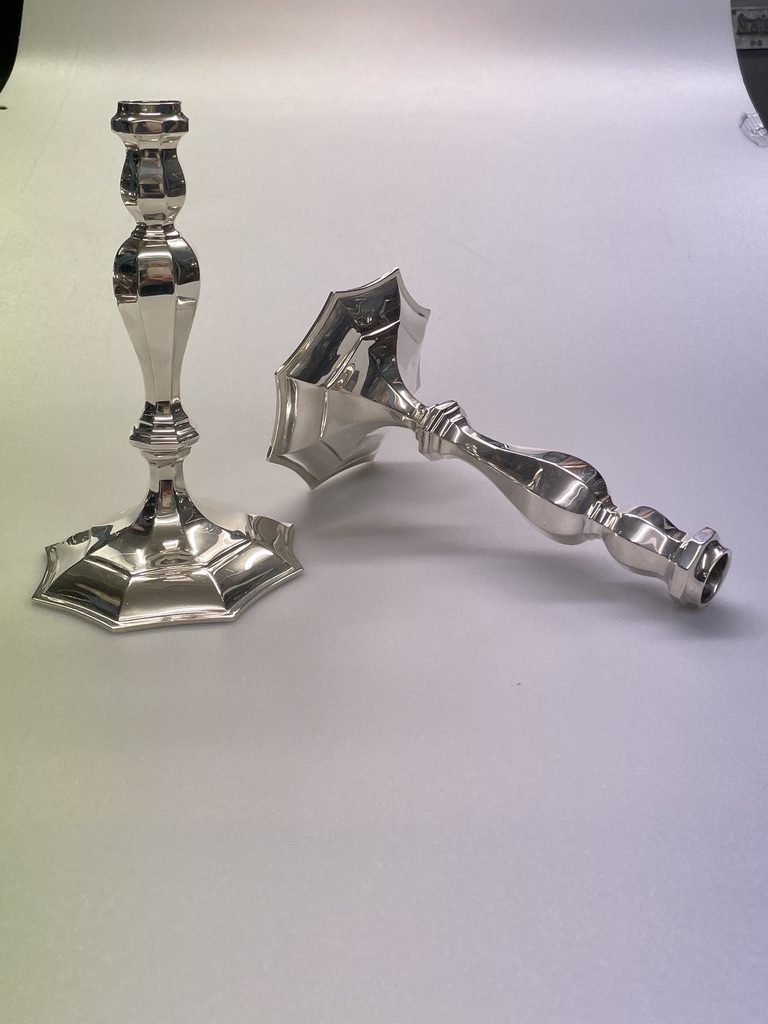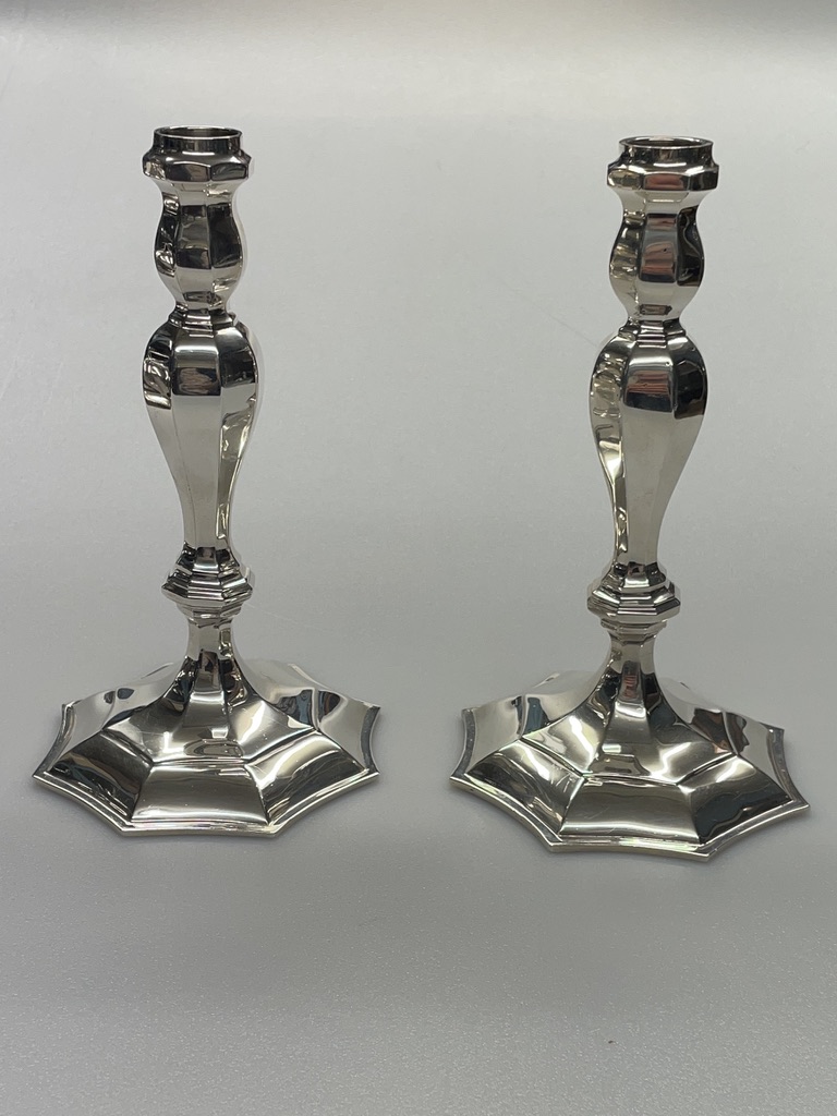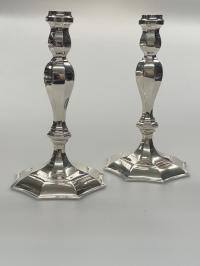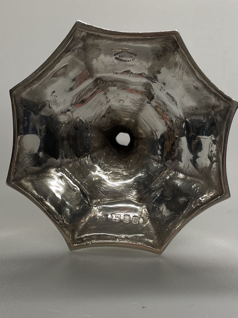 A pair of octagonal cast candlesticks made in Lonon 1960 by Carringtons, which stand 19cm high and weighs 628g the pair.