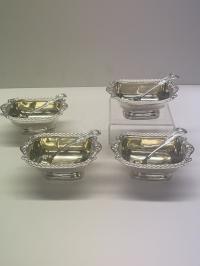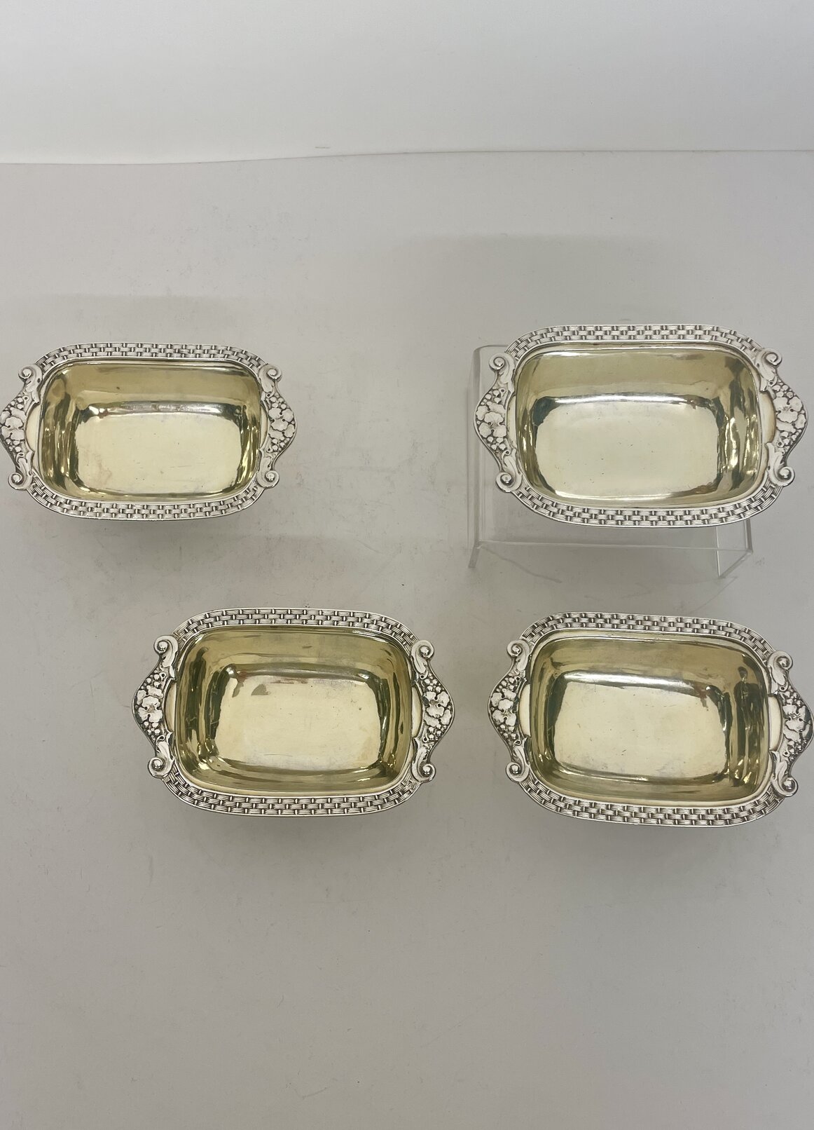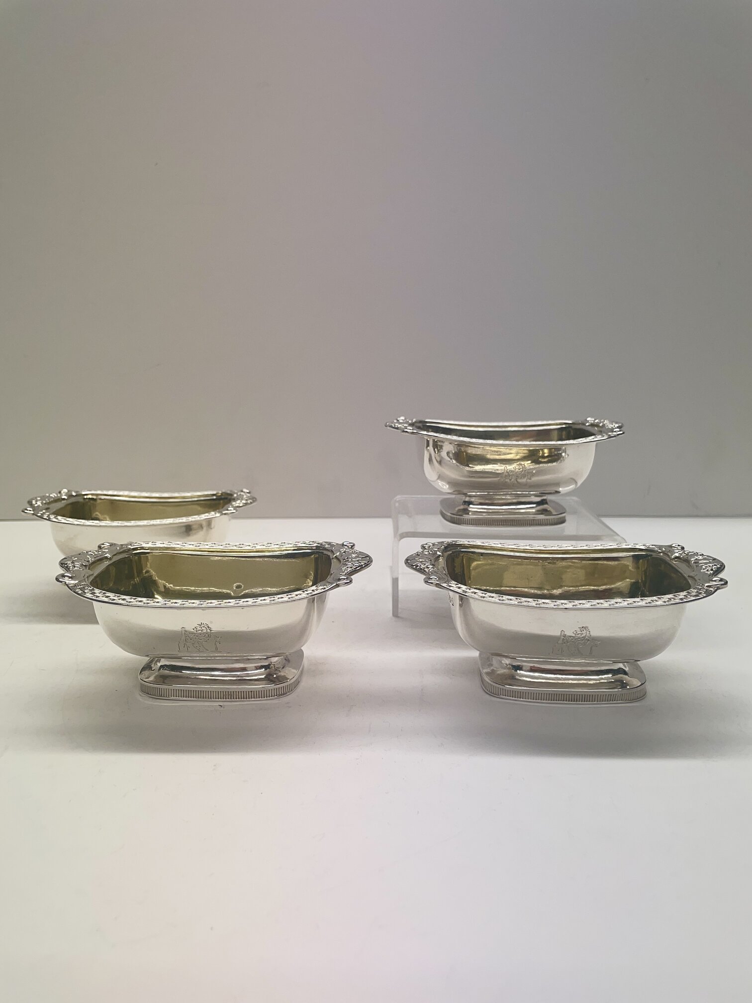 Set of four Rectangular Salts with unusual basket weave, scroll and grape vine border (some wear to border and gilt interior). Made in London in 1810 by Rebecca Emes and Edward Barnard. They weigh together 408 grams (13.1 troy ounces), 11 cm long. Engraved with the crest of a demi Seahorse.