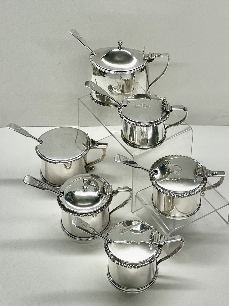 With: Set of six fiddle pattern Mustard spoons, made in London in 1857 by J & A Savory. Engraved with initial “L” . 120grams the six. £300 for the six