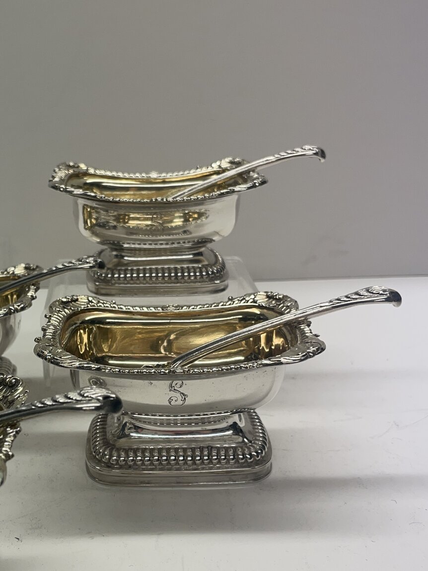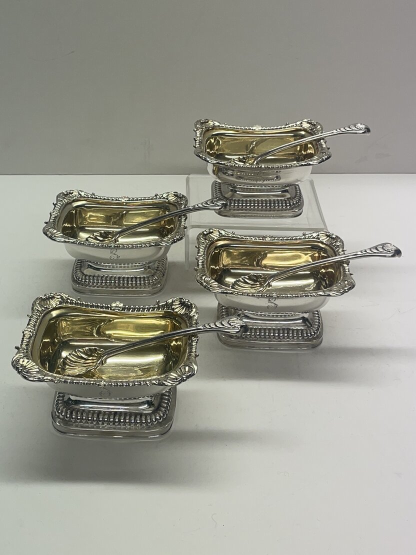 A set of fine condition shell, scroll and Gadroon border rectangular Salts. Made in London in 1809 by Joseph William Story & William Elliott, these are engraved with an original initial “S”.