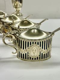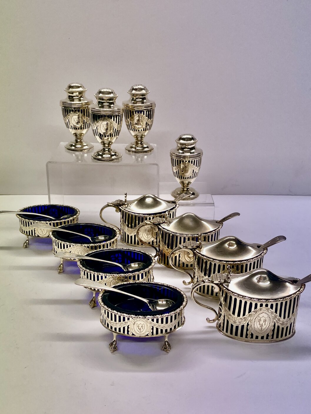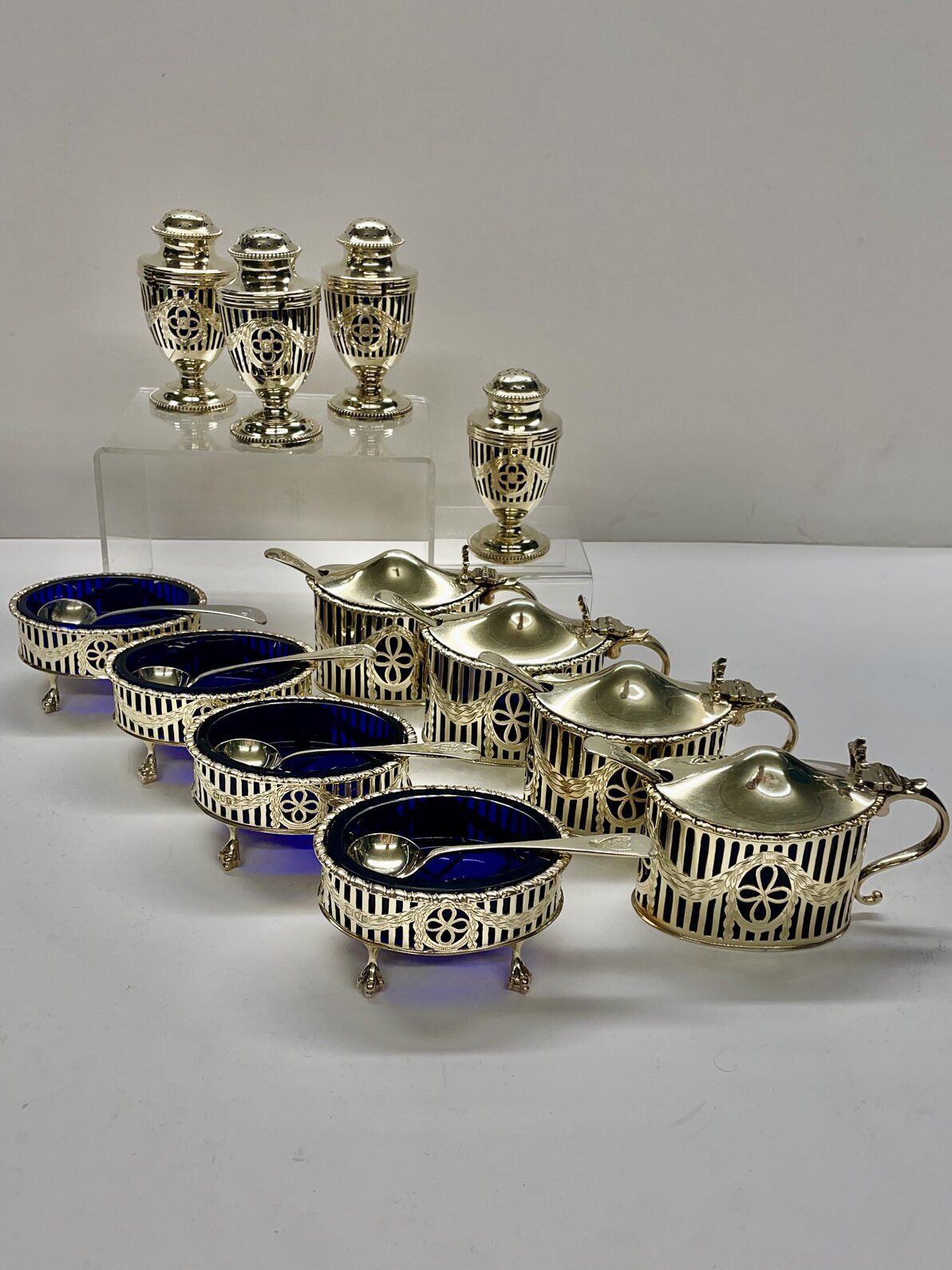 A large George III style silver gilt condiment set, with swag and palisade pierce work and blue glass liners. With cartouche to one side engraved with Coat-of Arms. Made in London in 1912 by Charles Stuart Harris, it consists of: