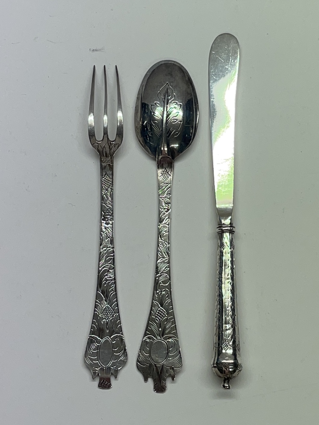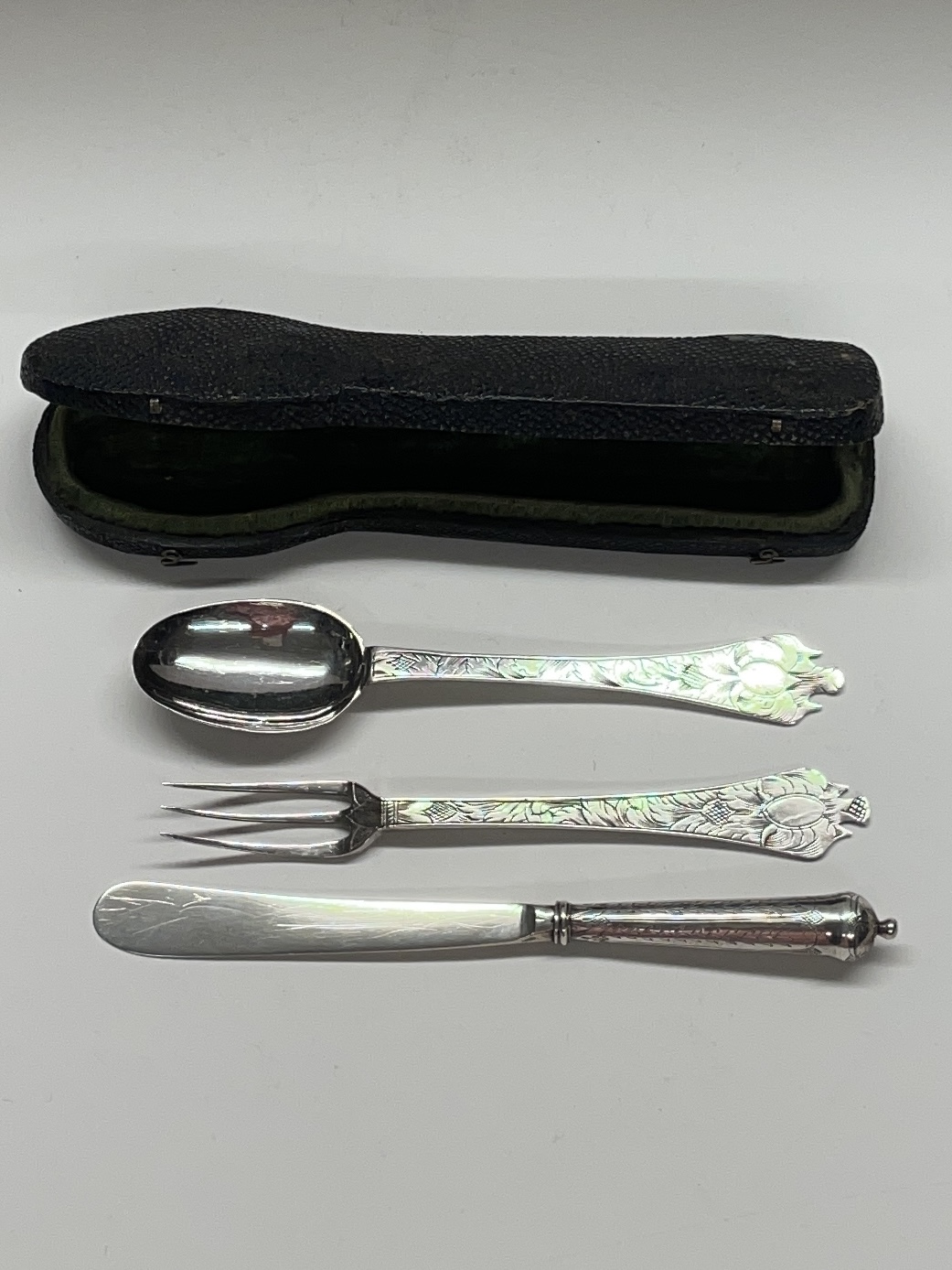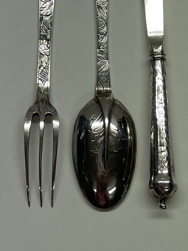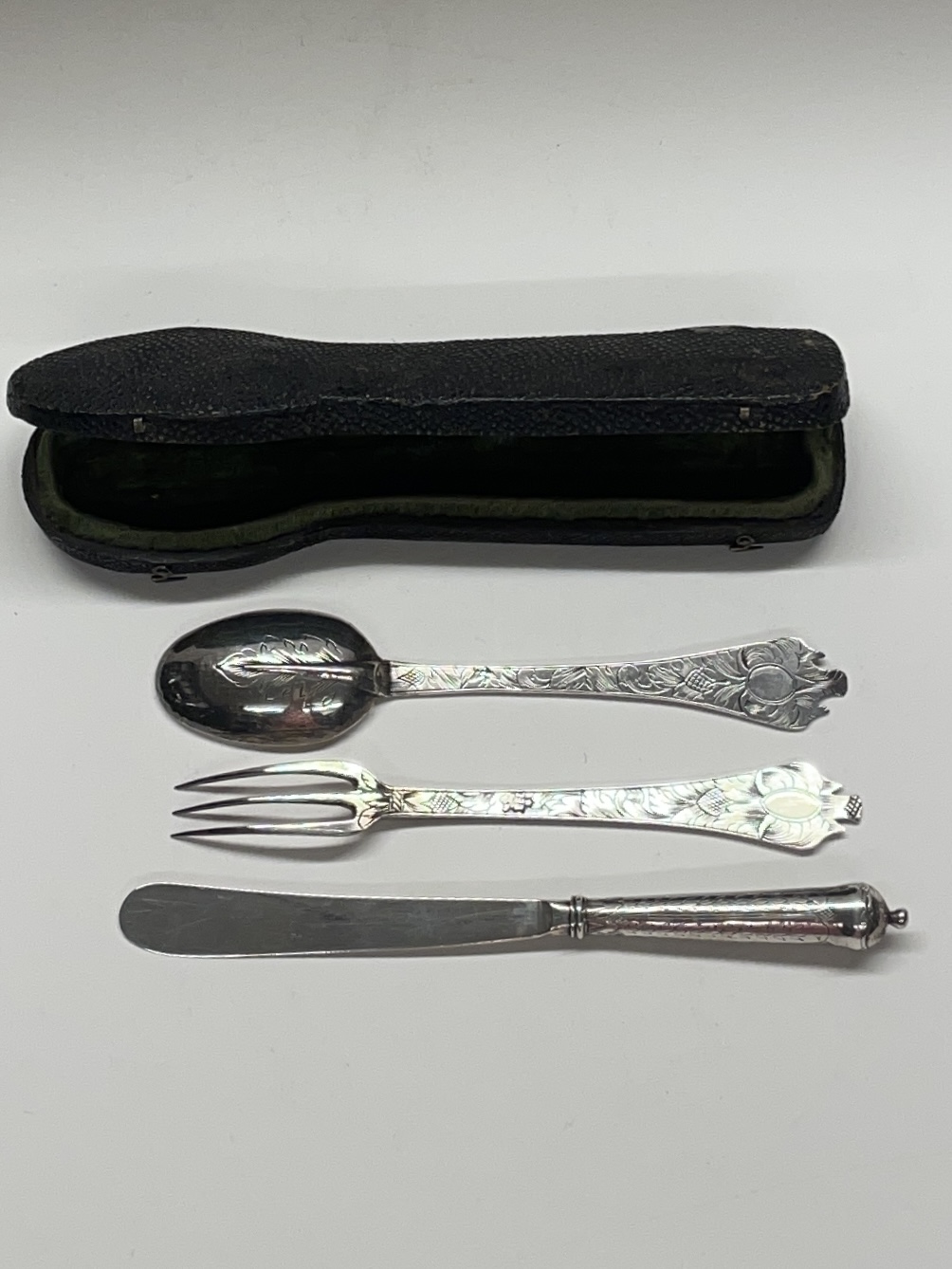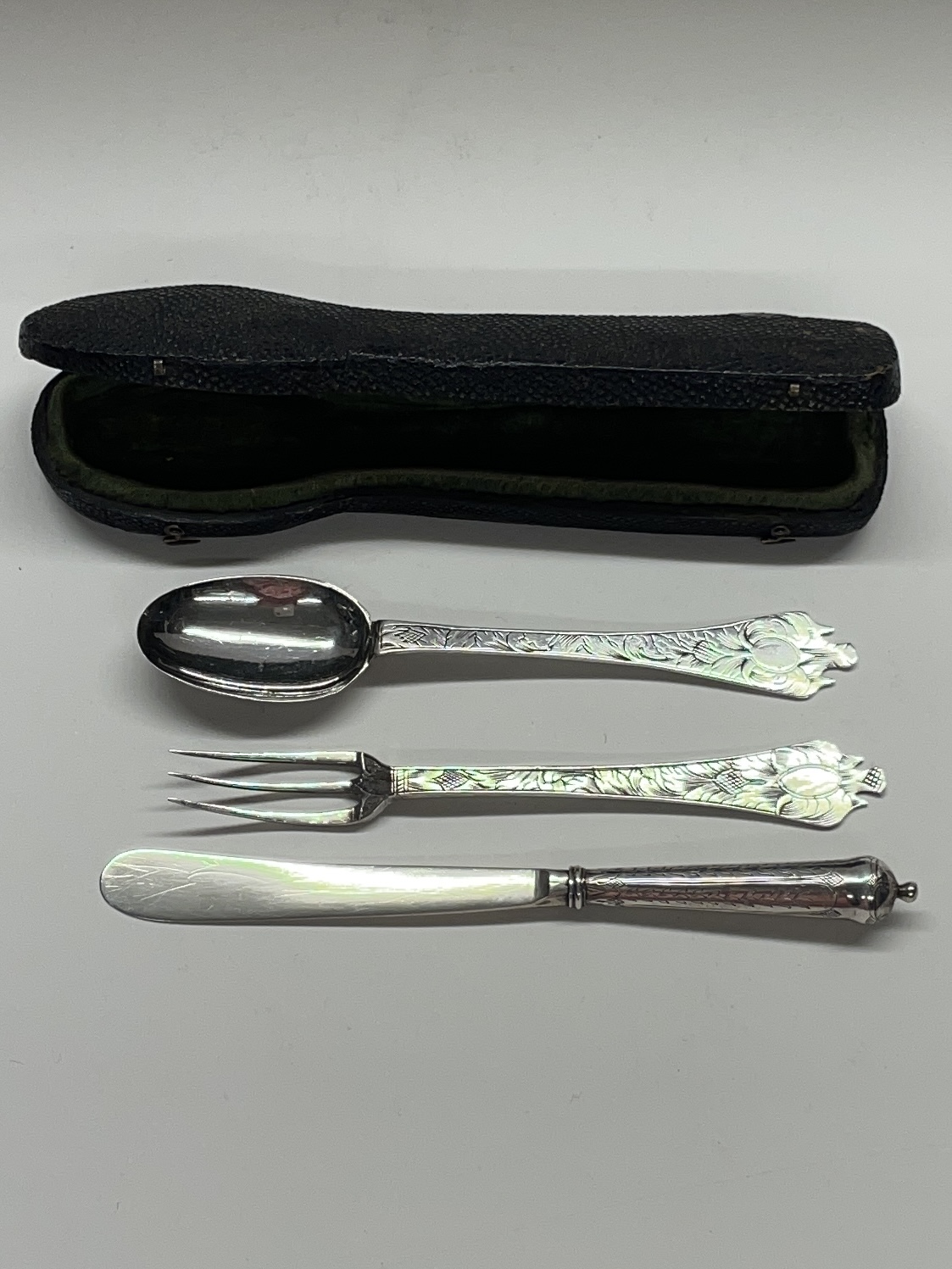 A shagreen case containing a small leaf engraved trifid spoon and miniature fork and cannon handled knife (London circa 1690, unmarked). The spoon and fork London circa 1690 bearing the markers mark only of IH crowned. These miniatures weigh 31g for the three pieces. The knife measures 12.7 cm.