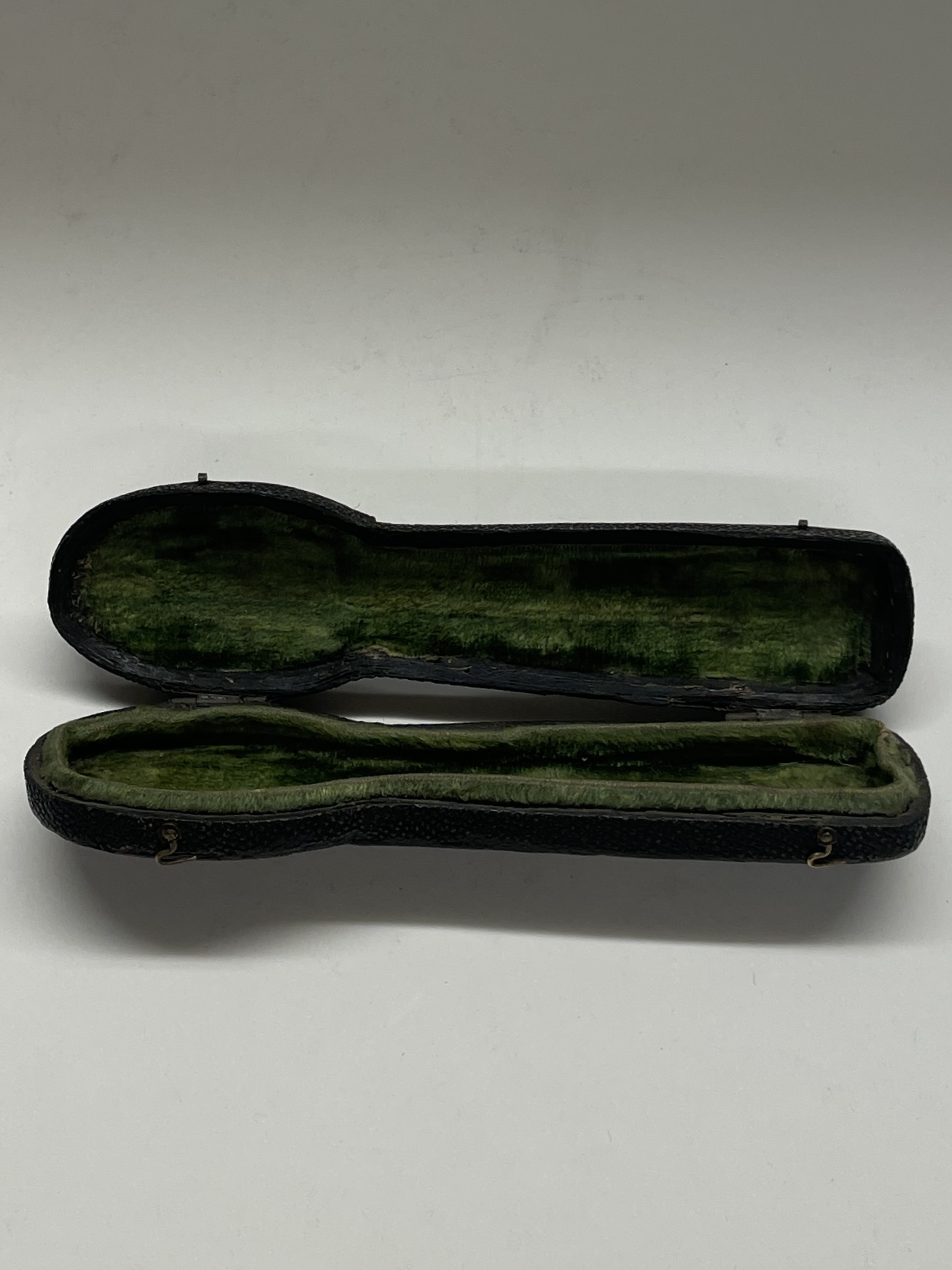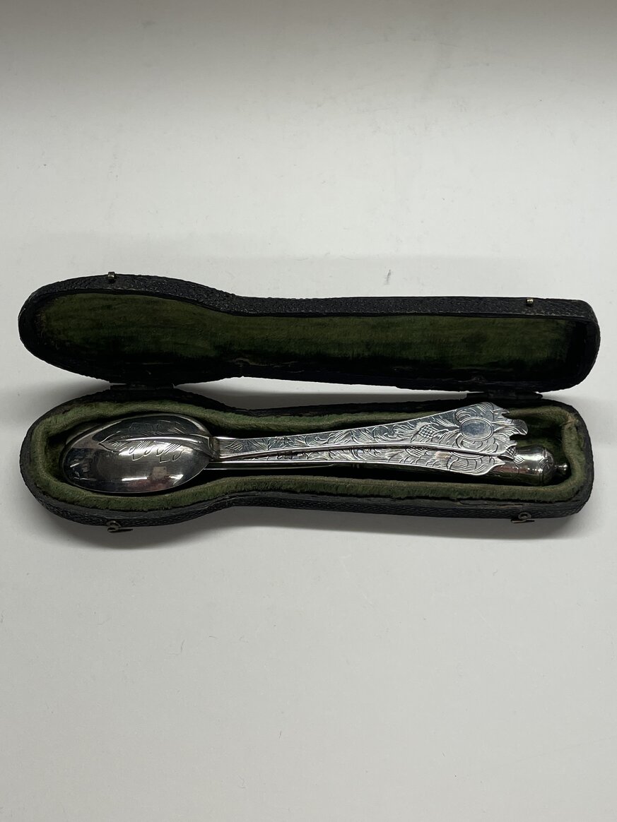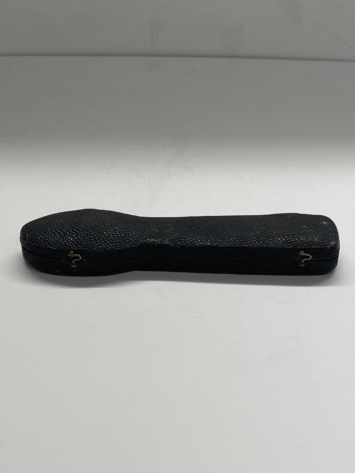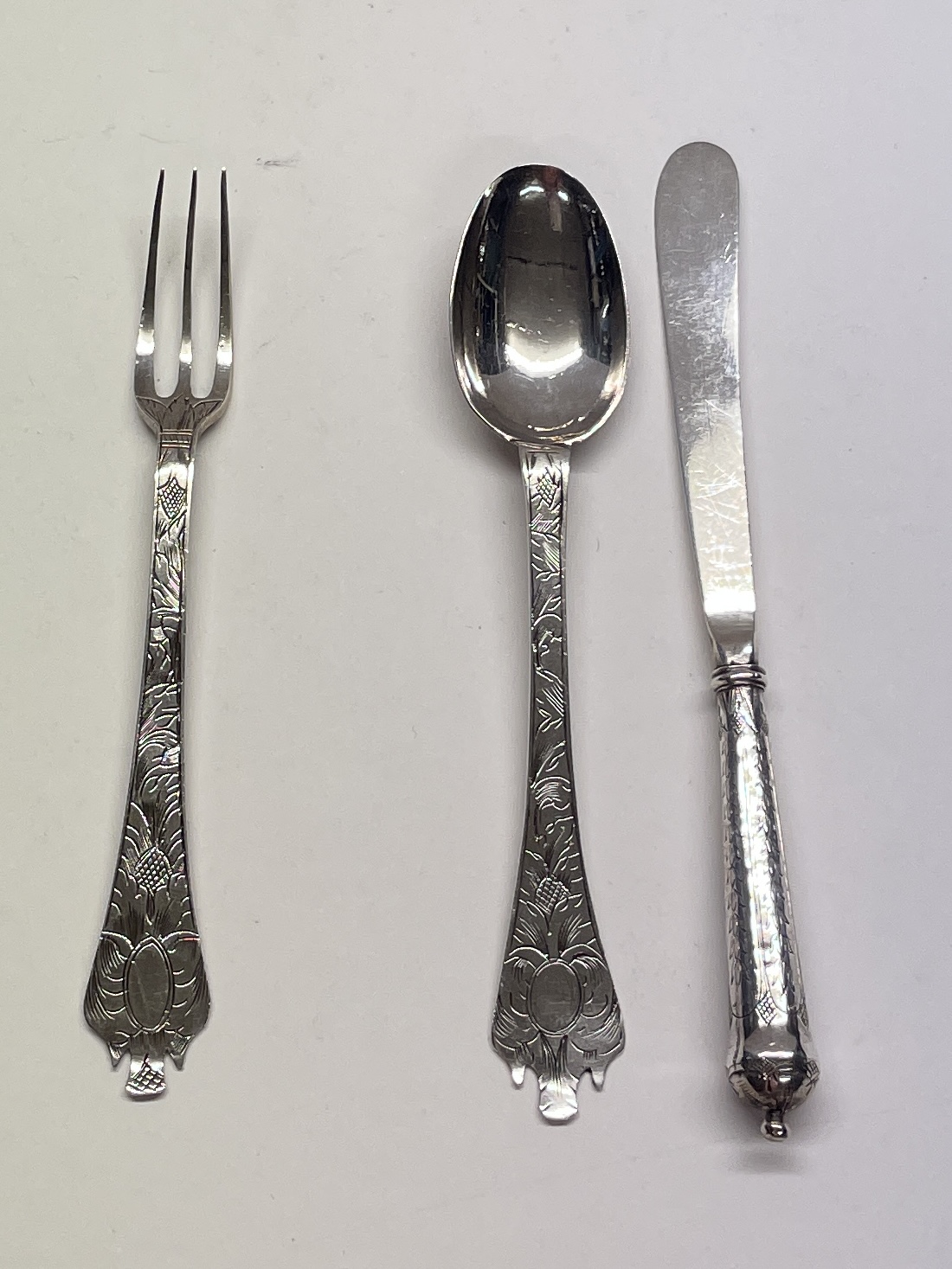 A shagreen case containing a small leaf engraved trifid spoon and miniature fork and cannon handled knife (London circa 1690, unmarked). The spoon and fork London circa 1690 bearing the markers mark only of IH crowned. These miniatures weigh 31g for the three pieces. The knife measures 12.7 cm.