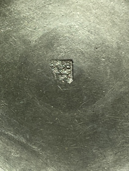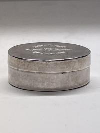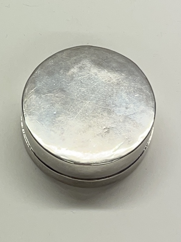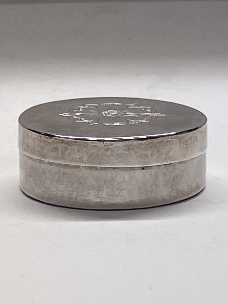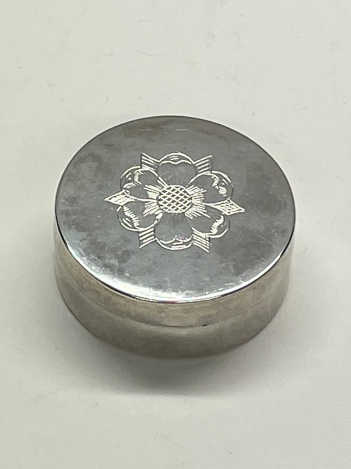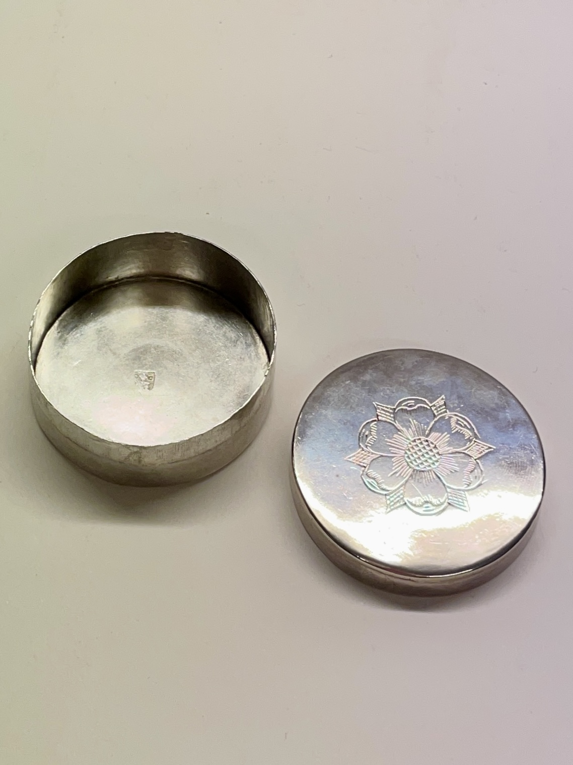 A large patch box engraved on lid with a flower, made in London circa 1680 by possibly William Middleton. It measures 4.7 cm in diameter.