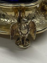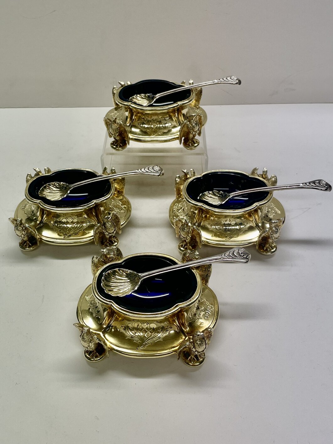 A set of four heavy silver-gilt salt cellars of lobed, oval trencher form. Each salt has four eagle supports with laurel wreaths, blue glass liner and is stamped Hunt and Roskell Late Storr and Mortimer.