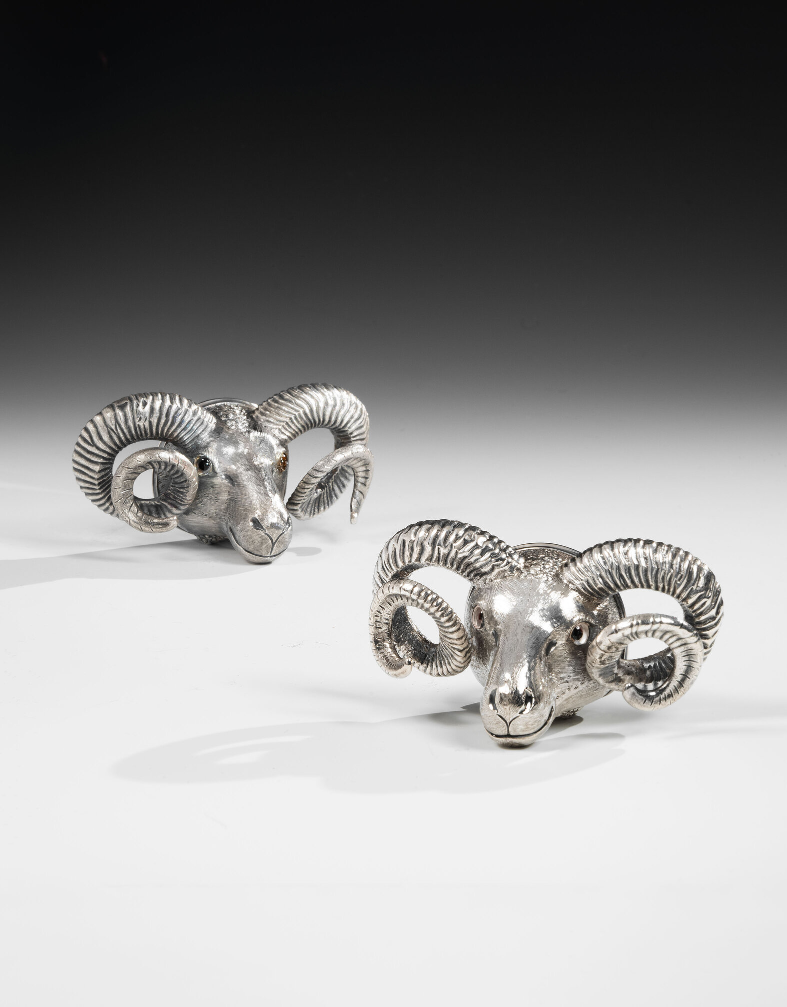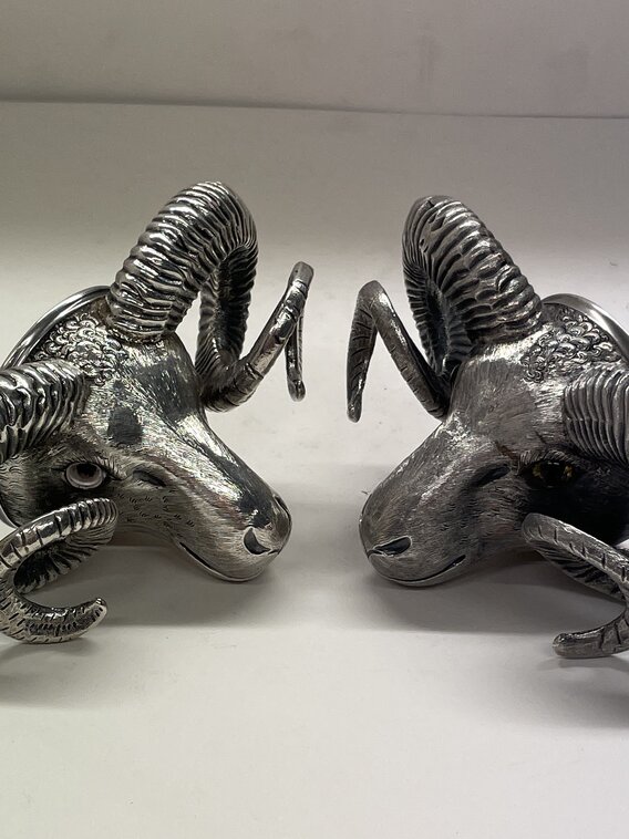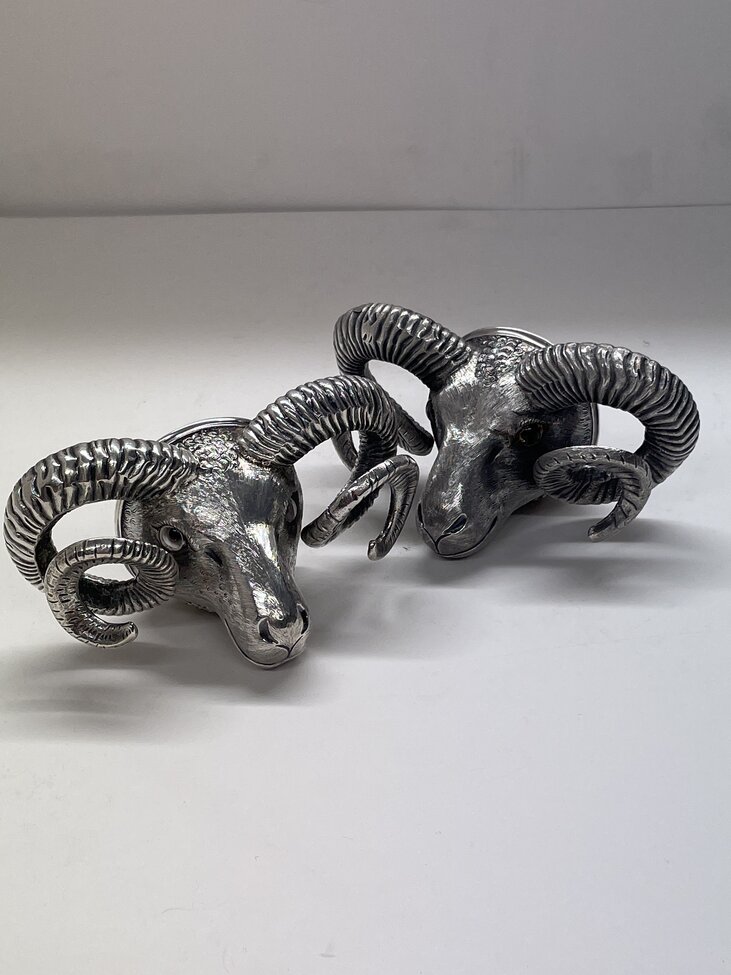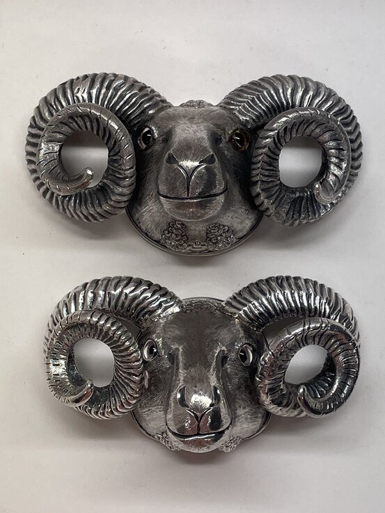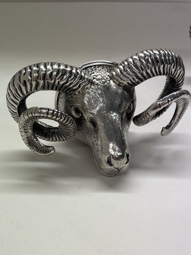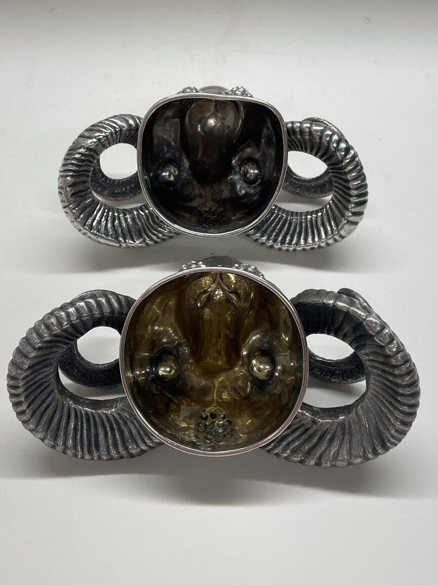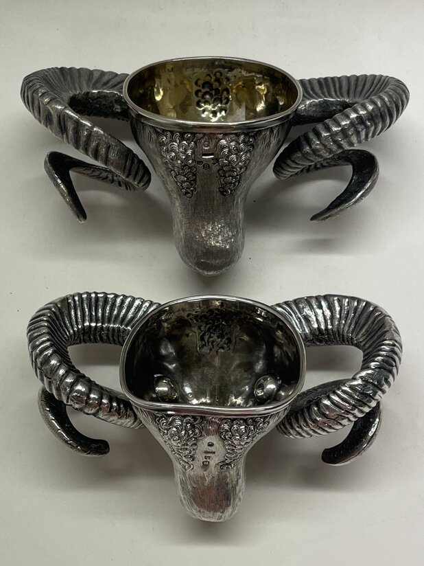 A similar Scottish pair of rams head stirrup cups, both made in Edinburgh 1858 by G M E, possibly George Edwards. They measure appro.11.5 cm across the horns and weigh together 312 g.