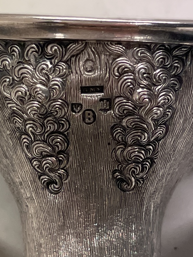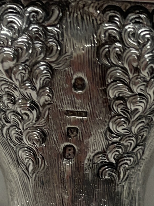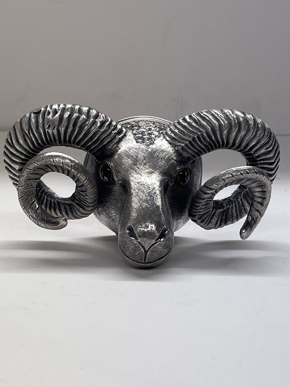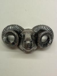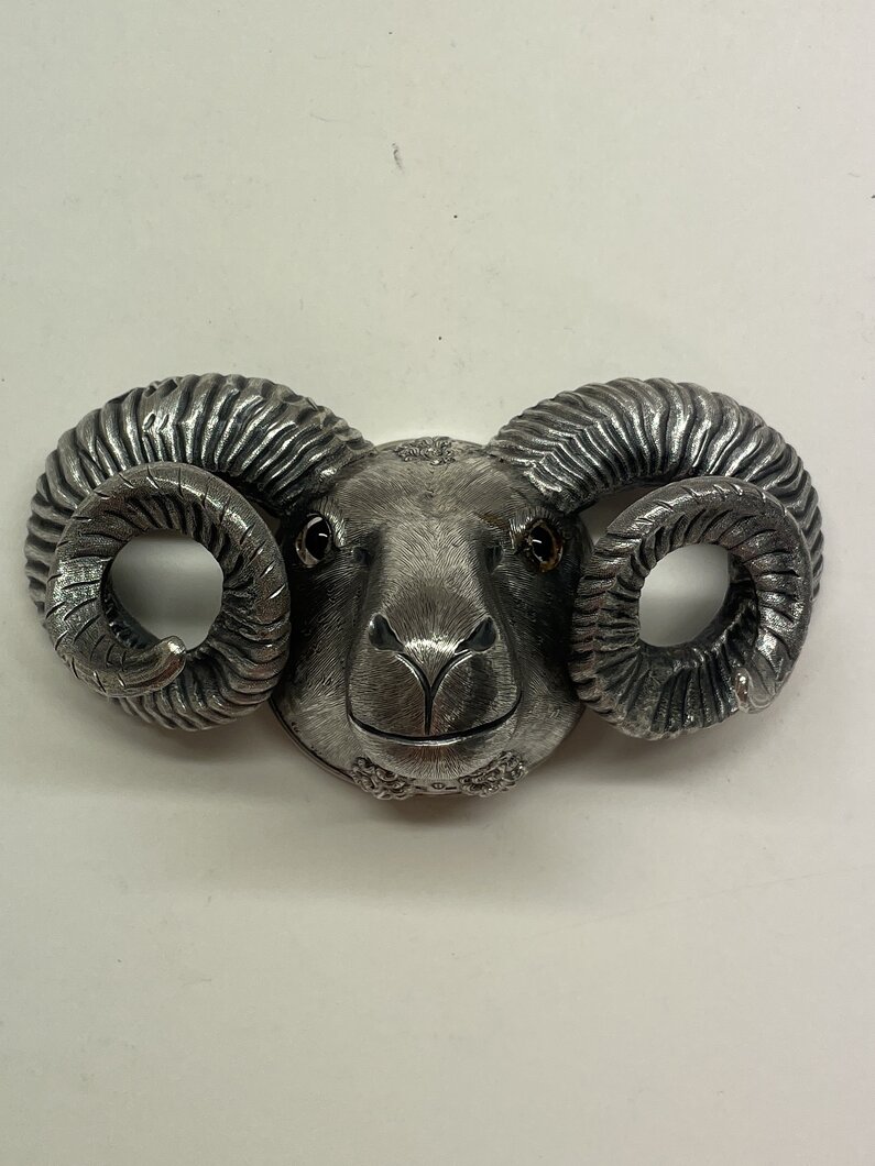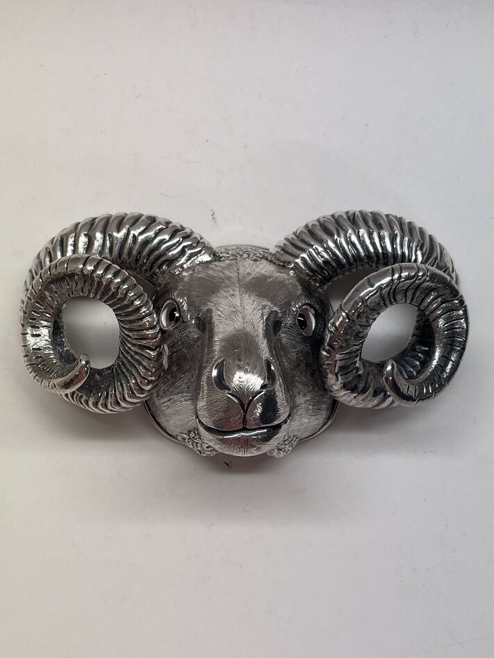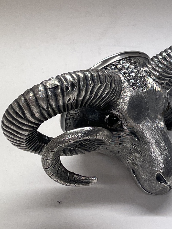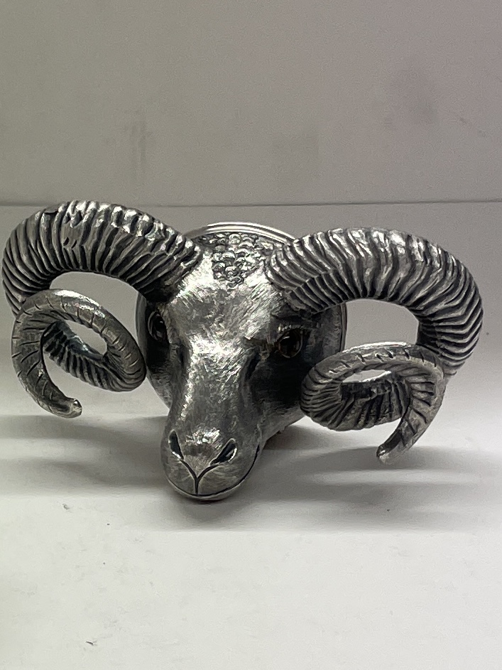 A similar Scottish pair of rams head stirrup cups, both made in Edinburgh 1858 by G M E, possibly George Edwards. They measure appro.11.5 cm across the horns and weigh together 312 g.