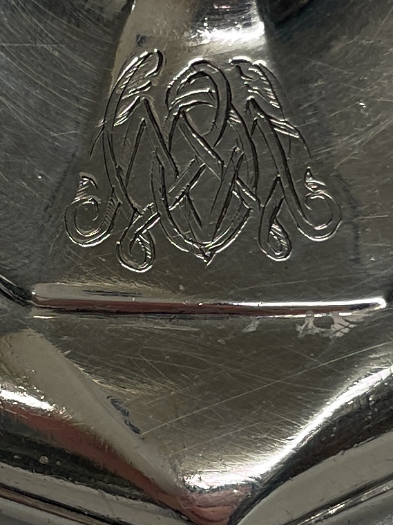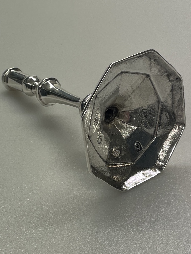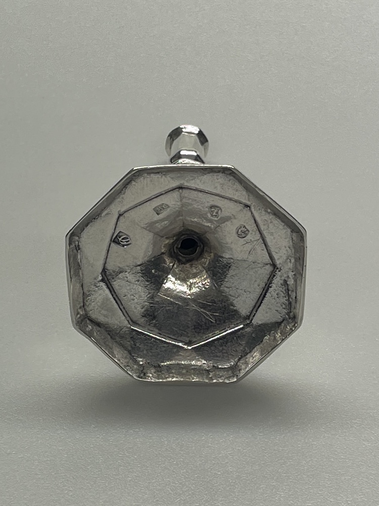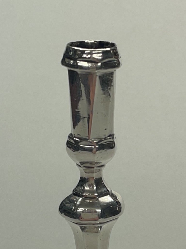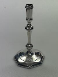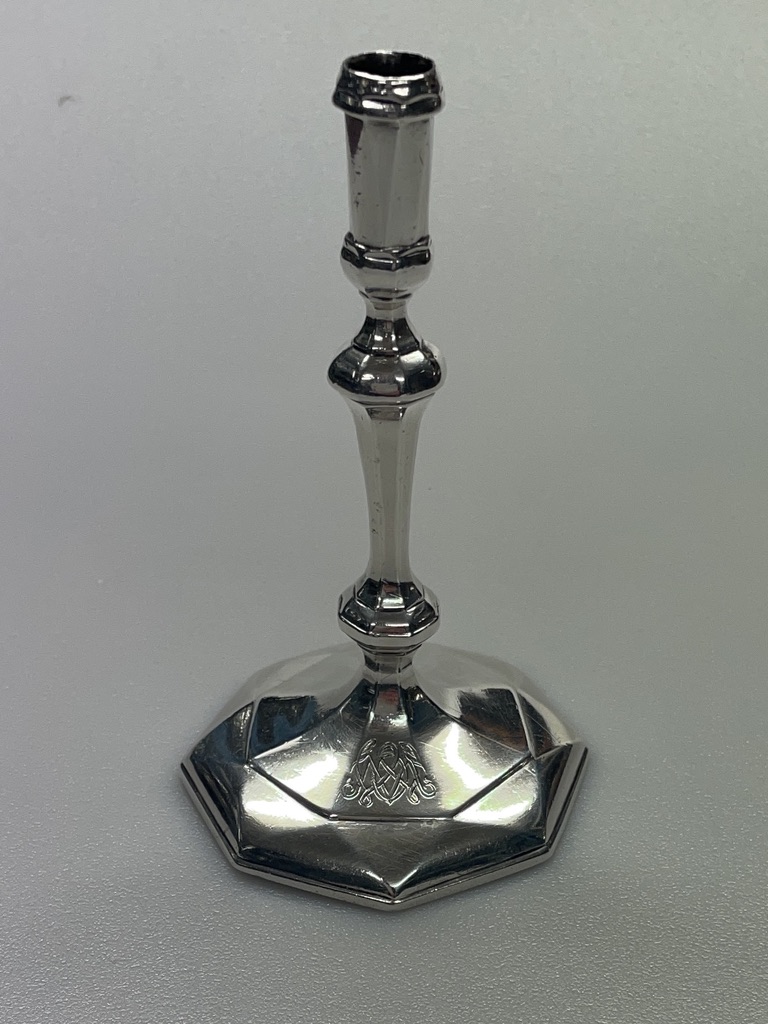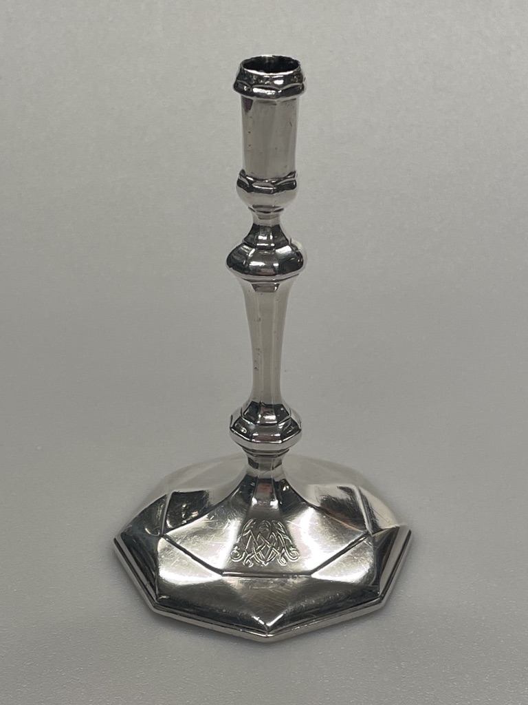 This Britanna standard taperstick with interlaced initials is clearly struck with hallmarks for London 1713 by Thomas Merry!