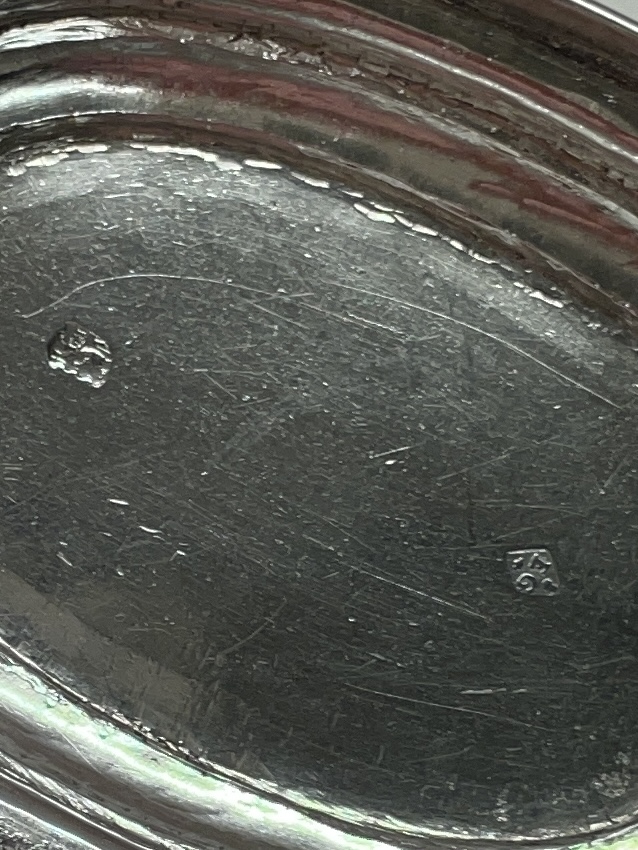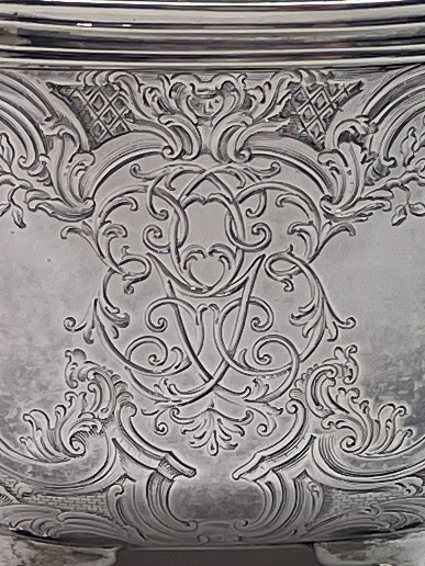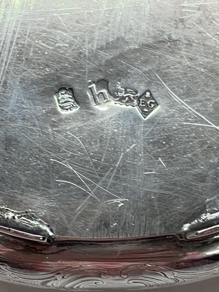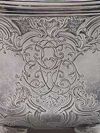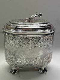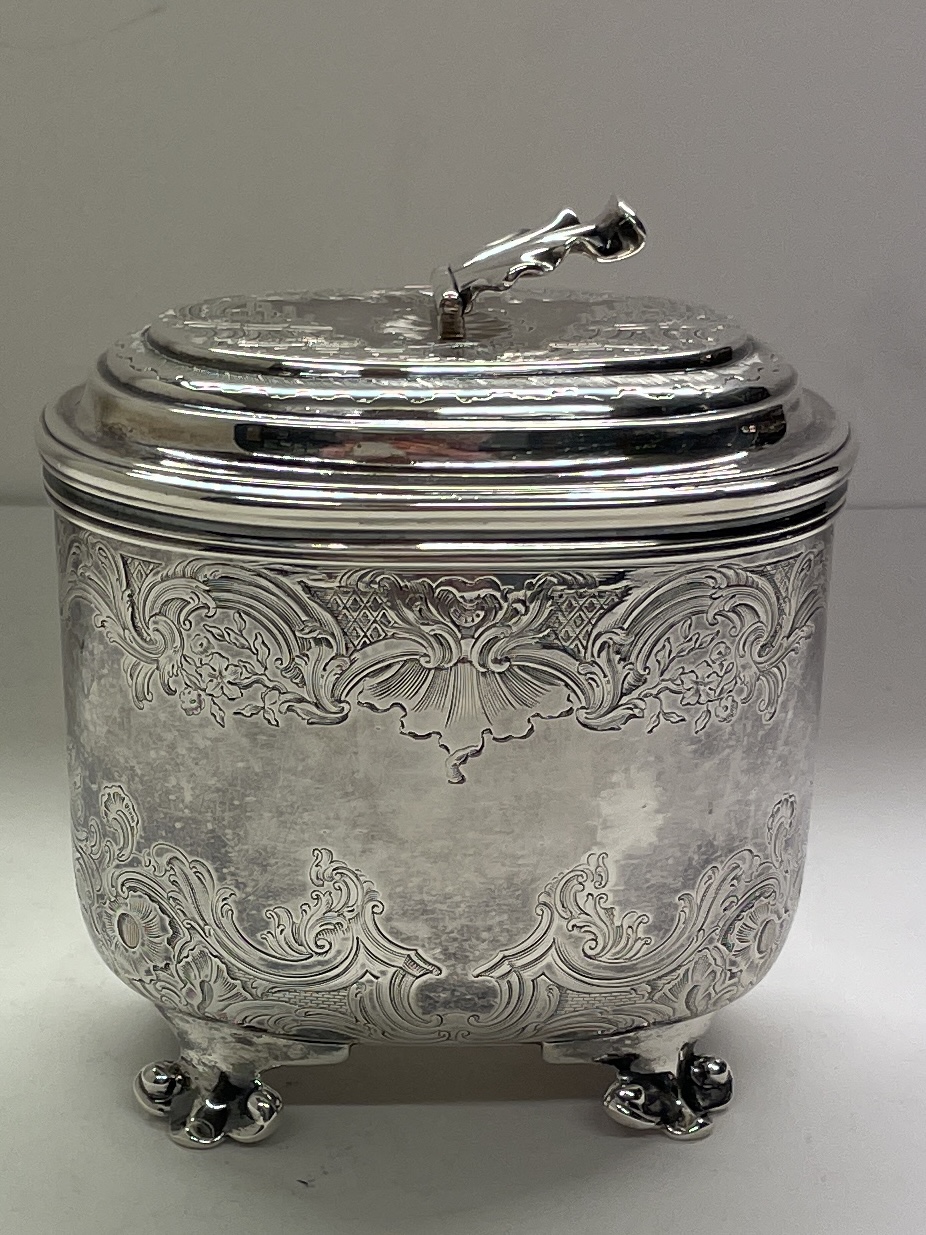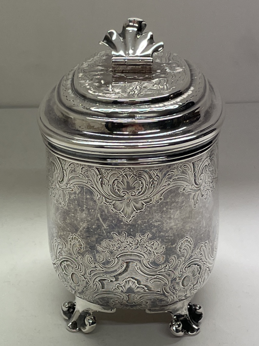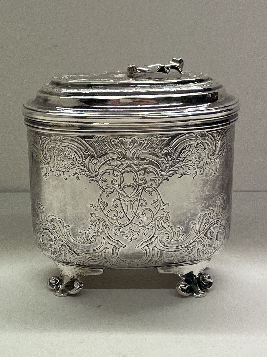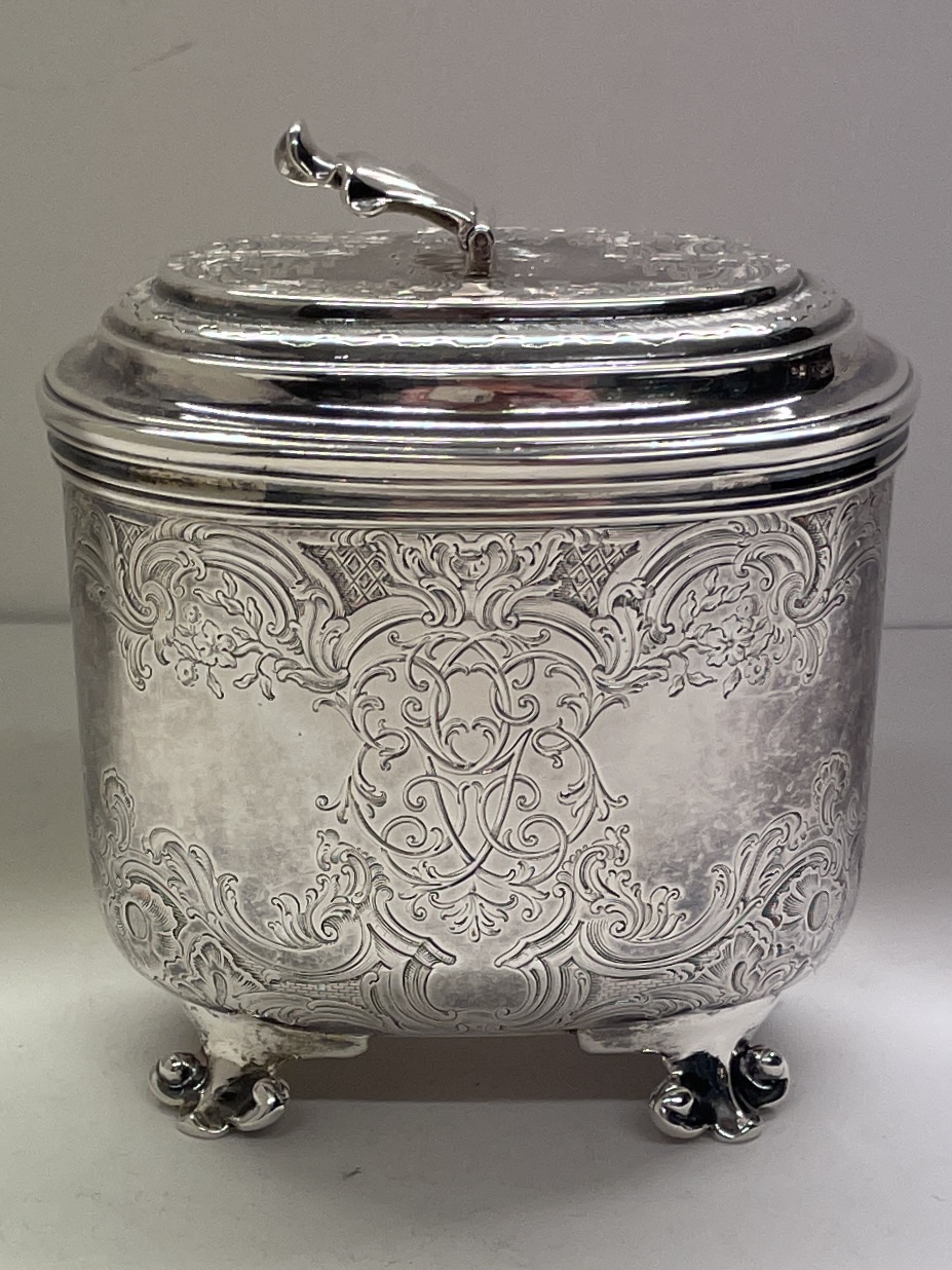 A heavy scroll and shell engraved tea caddy on four scrolled feet with shell thumb piece to lift off lid made in London 1743 by Eliza Godfrey. It weighs 487 g and standing appro.10.5 cm to top of lid and 11 cm across.