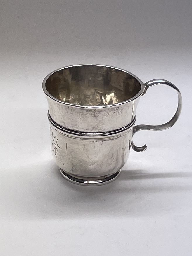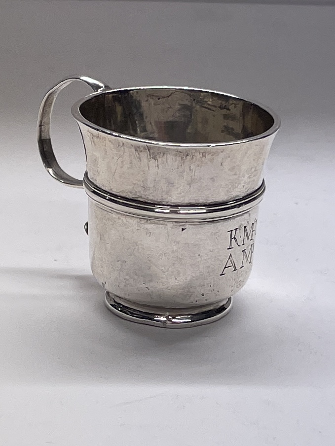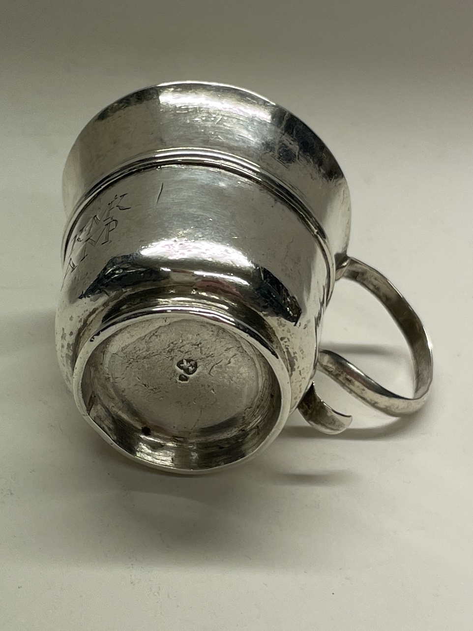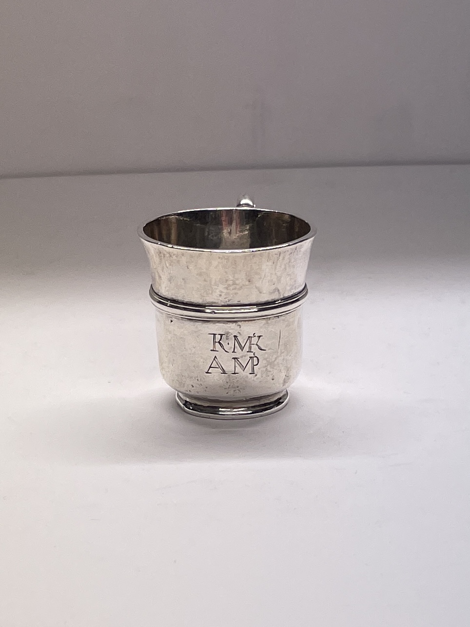 A miniature thistle cup, made in Edinburgh circa 1700 by Colin Mc Kenzie. Engraved with thew initials R MK above A MP it stands 4.5 cm tall.