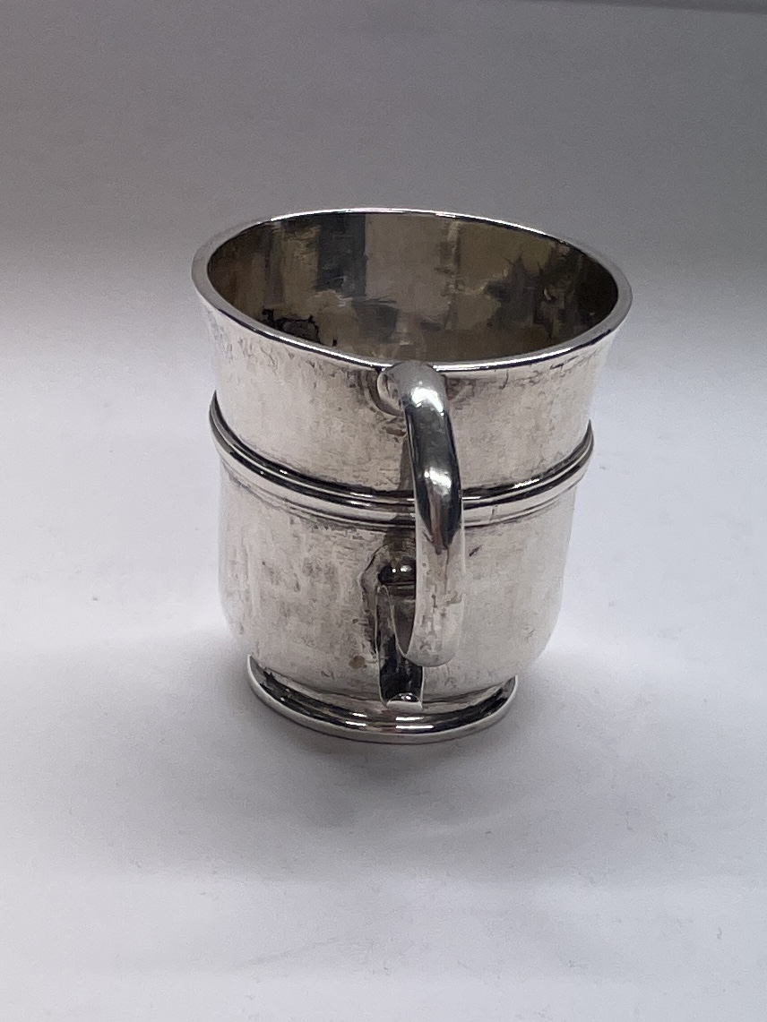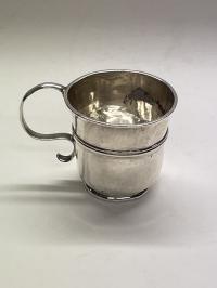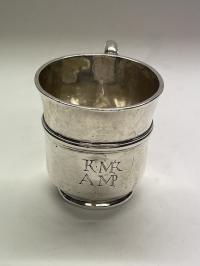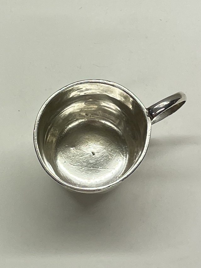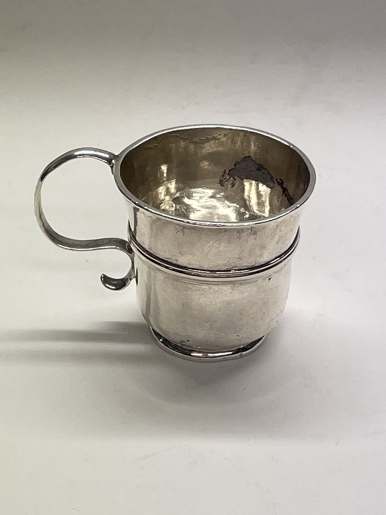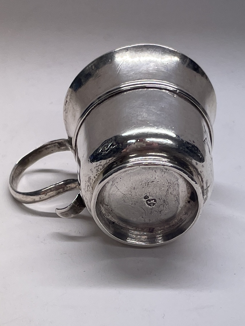 A miniature thistle cup, made in Edinburgh circa 1700 by Colin Mc Kenzie. Engraved with thew initials R MK above A MP it stands 4.5 cm tall.